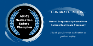 Richmond, Virginia, August 9, 2019 – The Alliance for Patient Medication Safety (APMS®) announcesthe Bartell Drugs Quality Committee and Korman Healthcare Pharmacy as recipients for the APMS® Medication Safety Champion award, June 19, 2019.